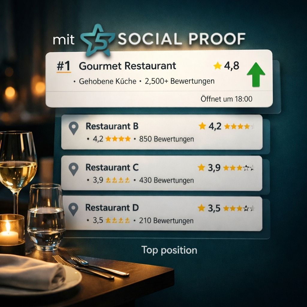 Viele positive Bewertungen verbessern Ihre Sichtbarkeit in Suchmaschinen, Karten-Diensten und Bewertungsplattformen. So werden Sie häufiger gefunden – genau dann, wenn Kunden nach Ihrem Angebot suchen.